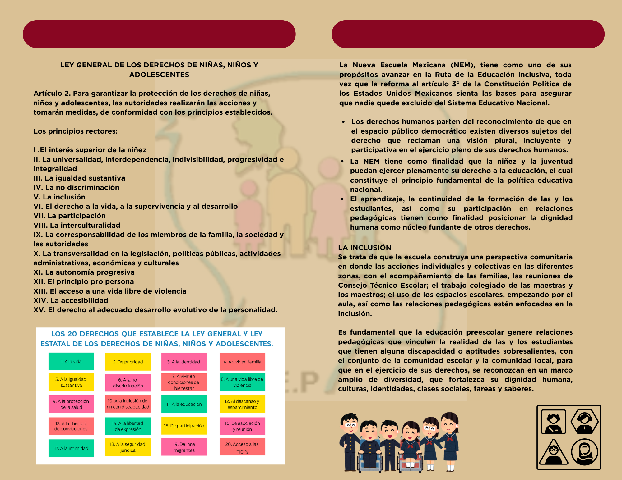 La Dirección General de Educación Inicial y Preescolar, pone a su disposición la infografía “La inclusión como un principio para asegurar el Derecho Humano a la Educación”, que tiene como finalidad ofrecer información para sensibilizar en la inclusión como un derecho humano, fundamental que implica valorar y respetar a todas las personas; en la práctica educativa garantiza la eliminación de las barreras que limitan el aprendizaje y la participación, promoviendo la accesibilidad en las escuelas, espacios públicos y privados.