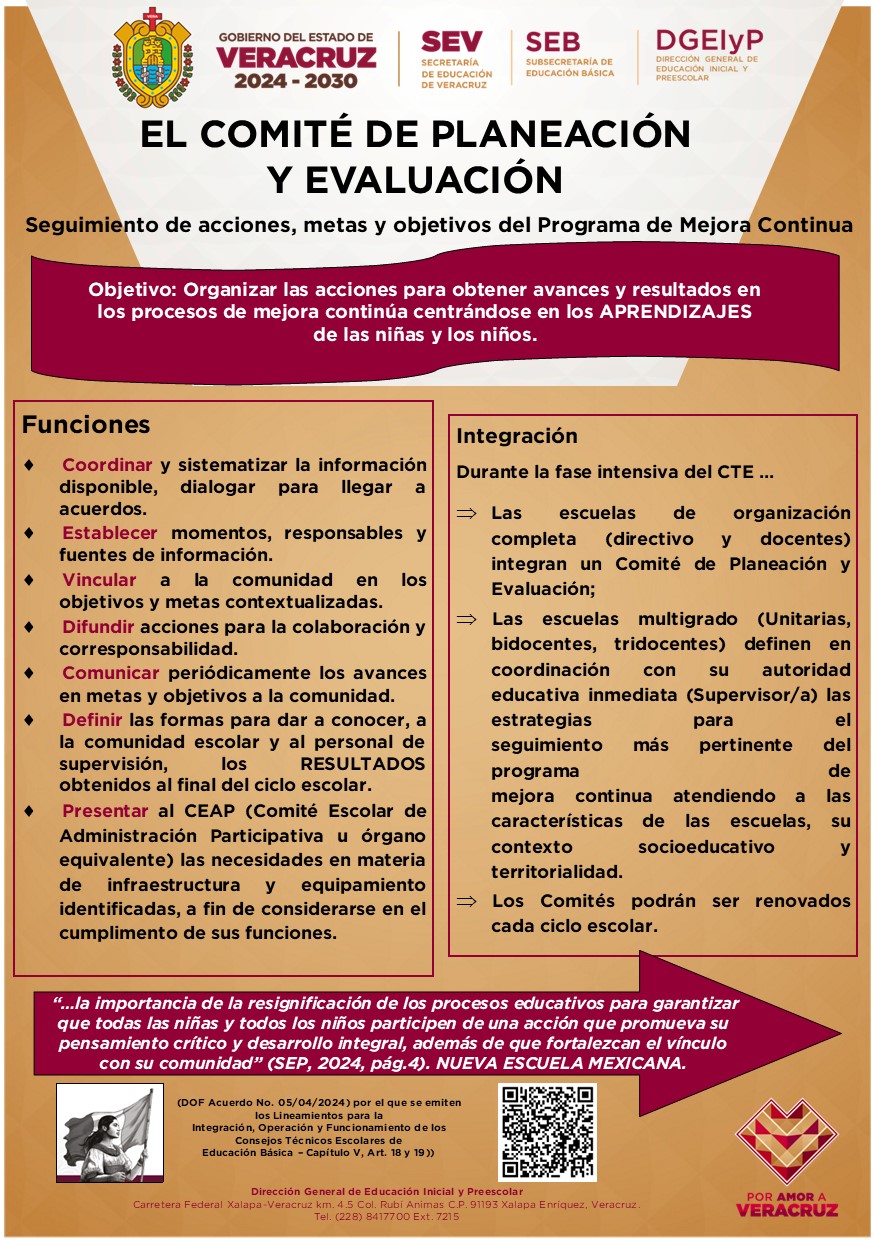 En esta primera entrega se recuperan los elementos centrales de las funciones y organización de los Comités de Planeación y Evaluación, destacando los procesos de mejora al interior de las escuelas, con énfasis en el logro de los aprendizajes de las niñas y los niños, por amor a Veracruz.