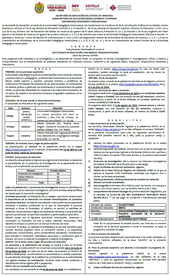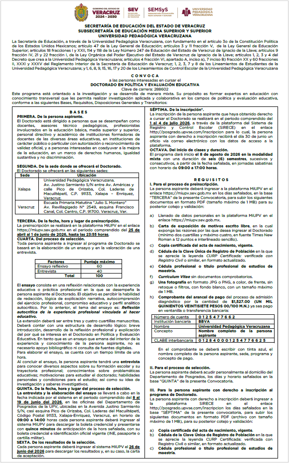 Ingreso a Doctorados 2026 DOCTORADO EN EDUCACIÓN CON MIRADA TRANSDISCIPLINAR DOCTORADO EN POLÍTICA Y EVALUACIÓN EDUCATIVA REGISTRO ABIERTO: MiUPV Del 25 de Abril al 1 de Junio 2026